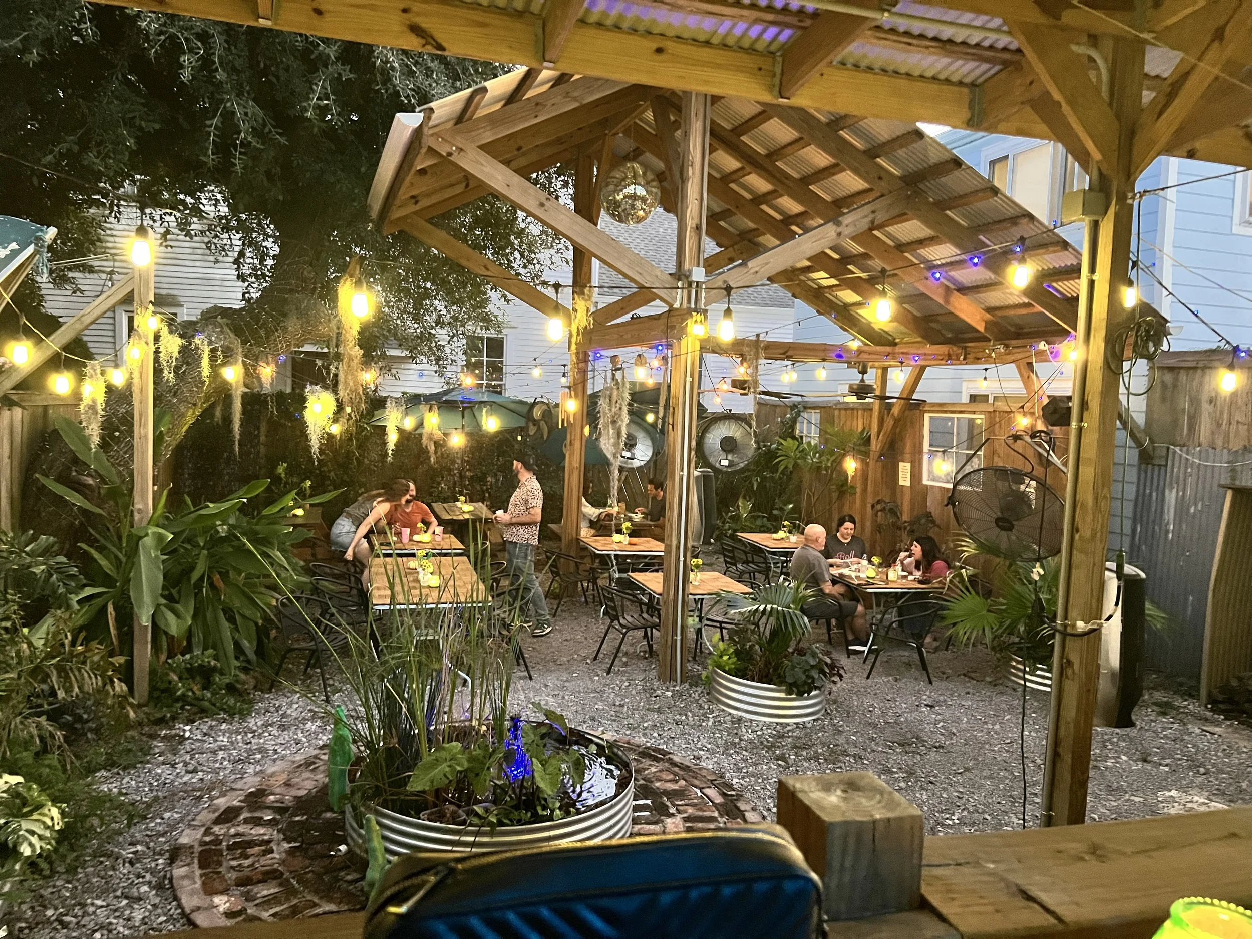 Most of the seating is in the backyard, a lush space filled with plants, a fountain, Tivoli lights, disco balls, Spanish moss, and the sound of zydeco music drifting through the air. It feels like home the moment you walk in, where laughter mixes with rhythm and every plate feels like a celebration.